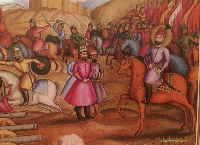 The scenes were painted by an official court painter who accompanied Nader Shah during his battles. Research carried out by Mardis Oven, a British connoisseur of Persian miniature paintings, and several other art connoisseurs in Iran, England, France, the United States, and Turkey have revealed that, so far as the history, style, and themes of paintings are concerned, no other illustrated manuscript similar to this one has been found. The first painting shows the campaign between Nader and Abdollah Pasha, the Ottoman general. The Persians have defeated the Ottoman army, and the corpse of Abdollah Pasha is on the ground at the feet of Nader’s horse. The person standing against Nader Shah with a book against his chest is Mirza Mehdi Khan. The second painting shows the campaign between Nader and the Afghans in the desert of Moorcheh Khort, Isfahan. The Afghans are fleeing before Nader’s troops. Nader is on horseback, and three persons are standing in front of him; the person on the left is his son Nasrollah Mirza, and the person in the middle is Mirza Mehdi Khan. Mirza Mahdi Khan Esterabadi (or Astarabadi) (d. 1760) was the chief secretary (monshi-mamalek), court historian, biographer, grand vizier (etemad-dowleh), foreign minister of Nader Shah Afshar (1698-1747). Mirza Mohammad Mehdi Khan Etemad-ed-Dowleh Monshi-ol-Mamalek (two honorific titles meaning “the trust of the State” and the “secretary of the countries”) Kawkab (a nickname that he used in his poetry) Esterabadi (sometimes also spelled “Astarabadi”) was born in the seventeenth century in Esterabad (current day Gorgan), a prominent town in northern Persia, to Mirza Nassir Khan Esterabadi, an important bureaucrat in the region. He spent his youth working in the Safavid dynasty’s court as a scribe until the Afghans invaded Persia in 1722. Nader Khan, a young colonel at that time, fought against the Afghans, and Mirza Mehdi Khan supported him. Thanks to his support, Mirza Mehdi Khan became the official court historian, strategist, advisor, confidant, friend, and chief secretary of Nader Shah Afshar. He was given the title “Monshi-ol-Mamalek” (equivalent to foreign minister at that time). When the Ottomans were beaten in 1739, Mirza Mehdi Khan and Mostafa Khan Shamlou were appointed as the ambassadors of Persia in the Ottoman Empire. That same year, Nader Shah was assassinated, and the two ambassadors went back to Persia with their army to try to put a Safavid prince on the throne, but they were defeated by Karim Khan Zand. Esterabadi spent the last years of his life writing books and poetry. He wrote the famous History of Nader Shah (Histoire de Nader Chah, Tarikh-e-Jahangoshaye Naderi), which is the main source of the history of Nader Shah and his conquests. Esterabadi died sometime between 1759 and 1768 (see Lockhart, Nadir Shah, p. 294 n. 1).